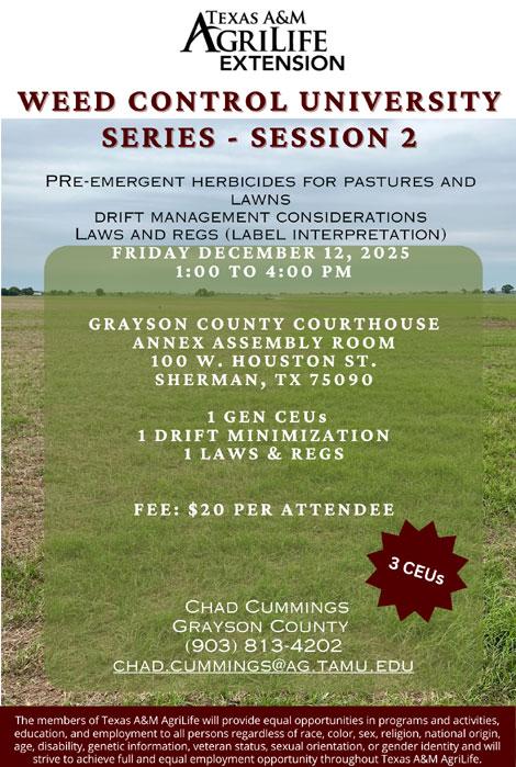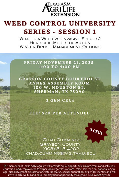 Sherman, Texas (November 14, 2025) – Texas A&M AgriLife Extension will be hosting the Weed Control University in Sherman, TX starting on November 21, 2025, at the Grayson County Courthouse. This course is open to the public and gives a step-by-step orientation to the use and understanding of how different weed and brush control strategies work.