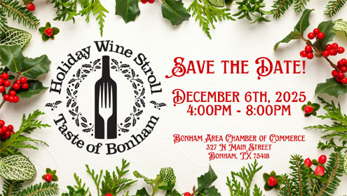 Bonham, Texas -- One of Bonham’s standout events for the holiday season returns December 6. Founded in 2017, this marks the 8th anniversary of the Holiday Wine Stroll & Taste of Bonham. Participants will be treated to tastings from eight North Texas wineries, delectable treats from eight local caterers and the opportunity to shop for the perfect holiday gifts from 14 downtown shops & businesses.
