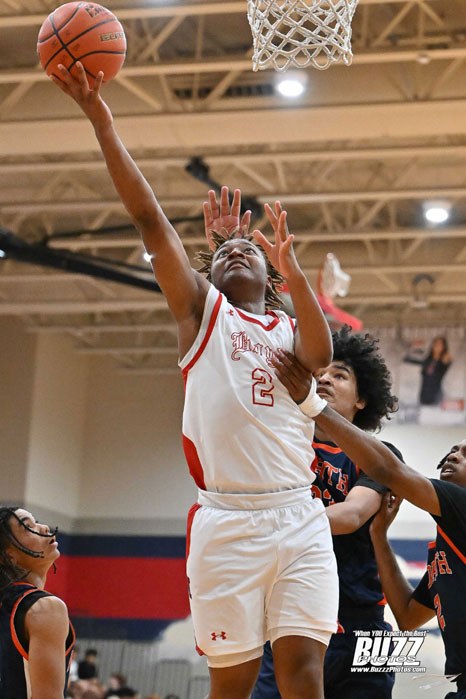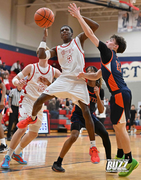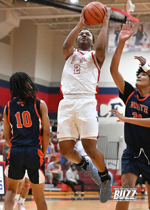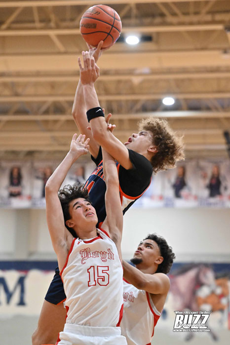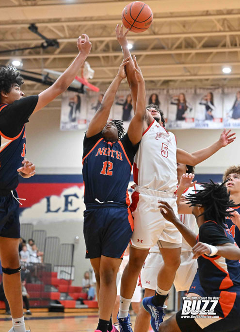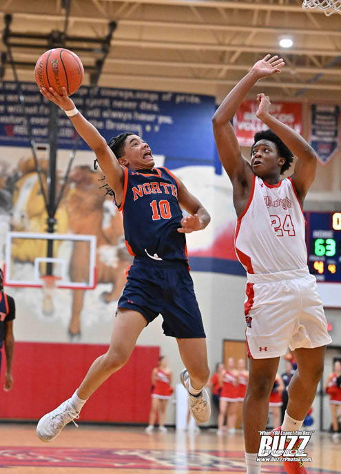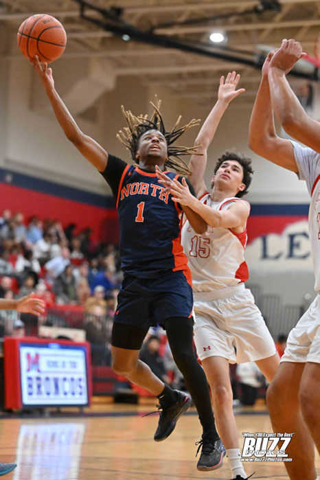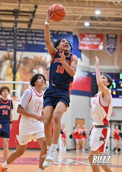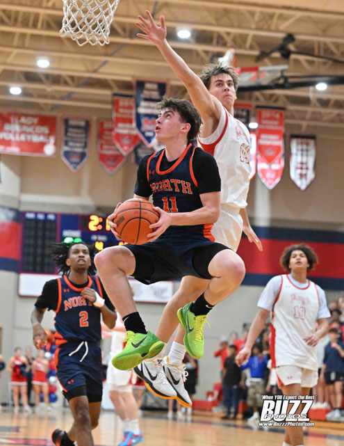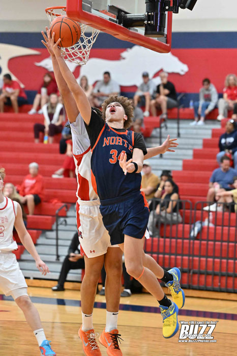 McKinney North sophomore Aiden Spurrier works to get a shot off under the basket.