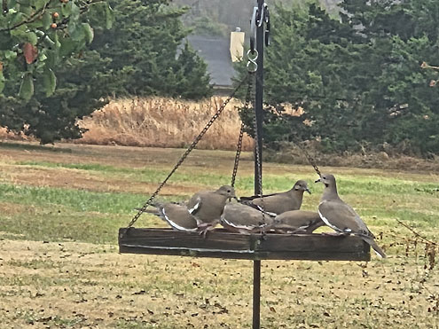 We retire the hummingbird feeders until next year and transition to our numerous bird feeders for the large and smaller varieties we hope will visit. As this occurs, we herald the arrival of our fall friends of squirrels, various other animals, and varieties of birds such as the white winged doves, Mr. and Mrs. cardinal, sparrows, chickadees, and there are always some surprising, colorful fall/winter winged species that drop in to enjoy the festivities.