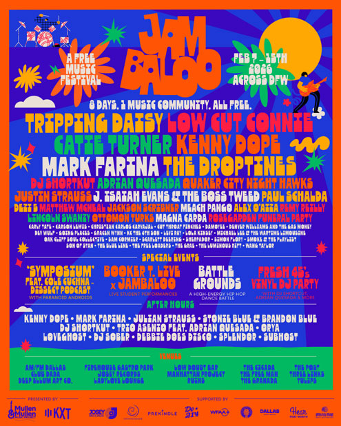 JAMBALOO 2026 is produced with support from Mullen and Mullen Injury Law, Amplified Minds, the Dallas Music Office, the Fort Worth Music Office, KXT, WFAA, Do214, Josey Records, Prekindle, Luminous Sound and numerous regional cultural partners.