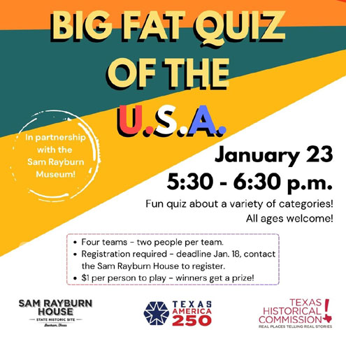 Bonham, Texas -- So, you think you know the United States of America? Prove it during our Big Fat Quiz of the U.S.A. at the Sam Rayburn House State Historic Site from 5:30 – 6:30 p.m. on Friday, January 23.