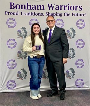 Special recognition was given to AJ Edwards. She earned reserve champion intermediate showmanship award at the State Fair. Hamlin presented her with a special coin he had made to recognize students and staff for outstanding achievements and noted that this is the first time he is presenting one of these coins at Bonham ISD.