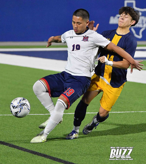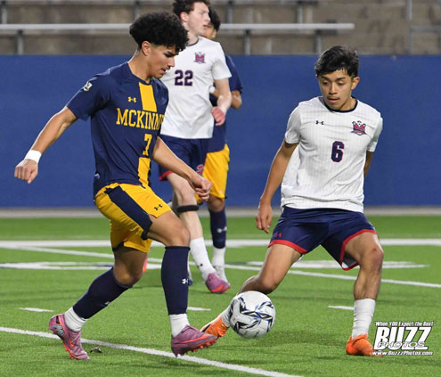 McKinney Lion Carlo Rodriguez (7) square off midfield against McKinney Bronco Giovanny Alejos (6).
