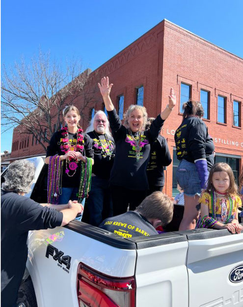 The parades have evolved over the years from the first little grass roots event in 2003 where fifty people and 20 dogs showed up, to a beloved civic event hosting thousands. Good weather easily brings 5,000 spectators to the square, all ready to catch Mardi Gras beads and items thrown from contestants. There will be 200 dogs in the parade and even more on the streets watching with their owners. Crowd friendly pets are welcome.