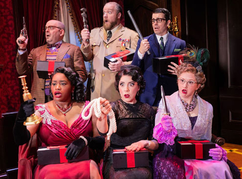 Camille Capers as Miss Scarlet, Nate Curlott as Colonel Mustard, Joseph Dalfonso as Mr. Boddy and others, TJ Lamando as Mr. Green, Madeline Raube as Mrs. Peacock, AT Sanders as The Cook and others, Zoie Tannous as Yvette, Kebron Woodfin as the Cop and others, and Kyle Yampiro as Professor Plum. The understudies are Thomas Netter, Allison Masulis, Taylor Tveten and Layne Roate.
