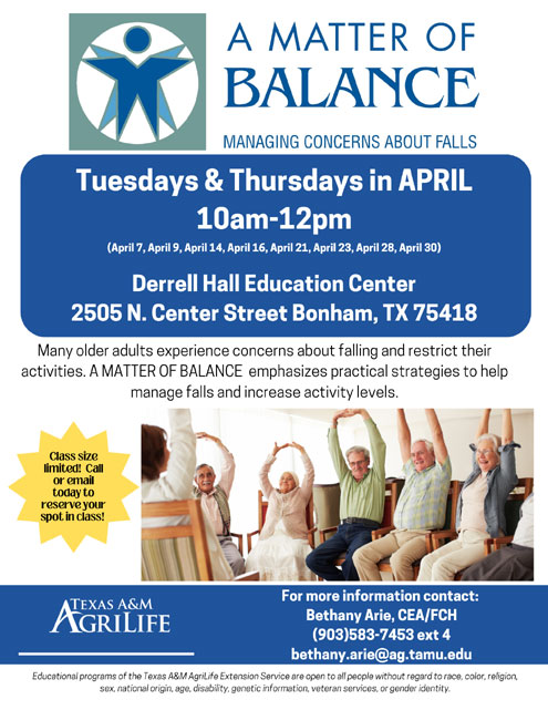 Fannin County, Texas -- Fannin County AgriLife Extension will be hosting A Matter of Balance, an eight-session program every Tuesday and Thursday in April from 10:00 am – 12:00, starting Tuesday, April 7th at the Derrell Hall Education Center, 2505 N. Center Street in Bonham.