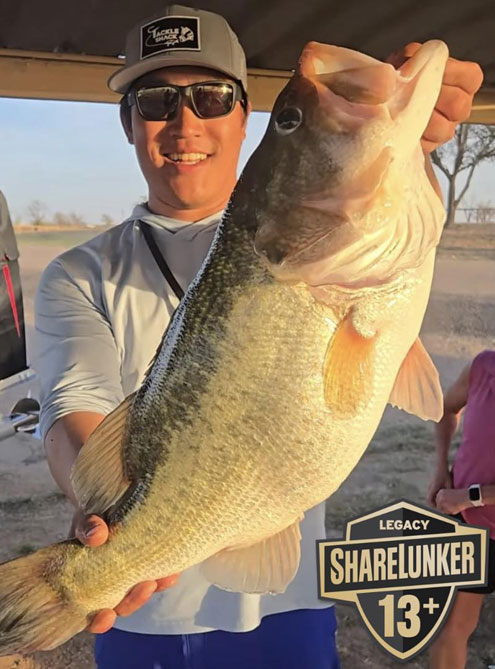 Previously, Lee caught 13.12-pound ShareLunker 696 at J.B. Thomas on March 8 and recorded his and J.B. Thomas’ first ever Legacy Class entry on Jan. 17, 2024, with 13.79-pound ShareLunker 651. ShareLunker 651 is the current lake record holder for largemouth bass at J.B. Thomas. Lee is now only one catch behind Josh Jones of Sapulpa, Oklahoma, for the most Legacy Class ShareLunkers submitted to the program. Jones landed his fifth Legacy Class largemouth bass at O.H. Ivie on Feb. 21 of this year with 13.51-pound ShareLunker 692.