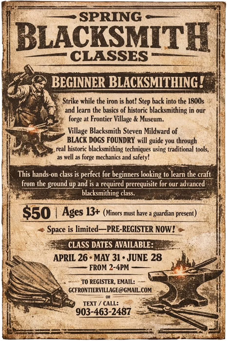 Denison, Texas -- Strike while the iron is hot! Step back into the 1800s and learn the basics of historic blacksmithing in our the forge at Frontier Village & Museum.
