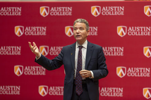 Following the presentation of the 2026 Posey Leadership Award to Rosen, O’Day shared his thoughts with the audience gathered in Wynne Chapel. “Whether you realize it or not, today, this talk is why you came to Austin College,” O’Day said to the students in the crowd. “This is liberal arts in practice. This is sitting down and thinking deeply about connecting the dots of things that may seem unrelated to each other, and yet they are. And to have Jeff Rosen come to our campus over the course of the year, to have these conversations that culminate in today's call. This is the liberal arts. This is Austin College.”