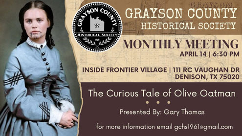 Denison, Texas -- Step back into the Texas frontier and uncover the remarkable story of Olive Oatman—often remembered as the “Tattooed Lady.” Imagine, if you will, a 19th-century Victorian woman sitting for a portrait: dressed in proper attire, poised and reserved. But as she turns her face, you see five distinct blue lines tattooed across her chin—marks not of fashion, but of survival. Her story is one of captivity, resilience, and life on the edge of two worlds. Come and hear this fascinating tale, enjoy refreshments, and visit with friends.