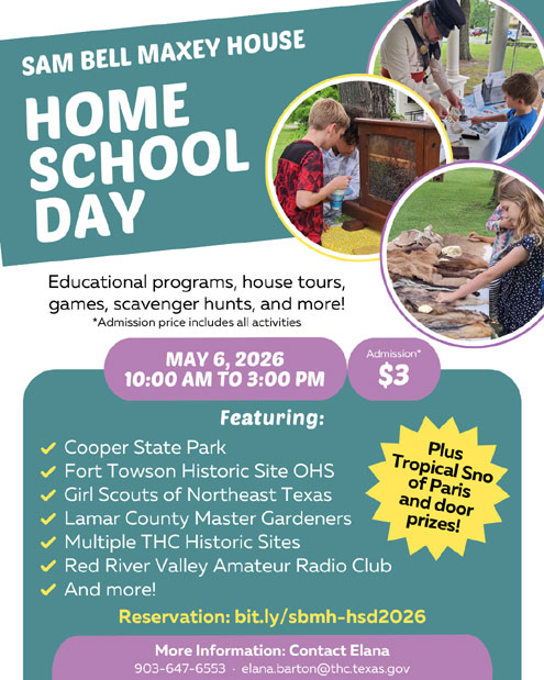 Paris, Texas –– Homeschool families and groups from across north Texas are invited to “Homeschool Day” at the Sam Bell Maxey House State Historic Site in Paris on Wednesday, May 6, 2026.