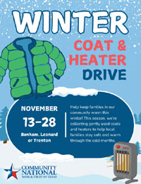 Community National Bank & Trust of Texas is hosting a Coat & Heater Drive November 13-28 in Bonham, Leonard and Trenton!