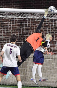 McKinney Boyd Bronco goalkeeper Kongphop Pornjaroenwiwat (1) with a save on goal against the McKinney Lions. (photo by Lockard Koval/BuzzPhotos.com)
