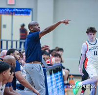 McKinney North head coach Demarkus Barnes directs his players. The Bulldogs won the game 55-53 on January 16th, 2026 at McKinney North High School. (photo by Buzz Cory / BuzzPhotos)