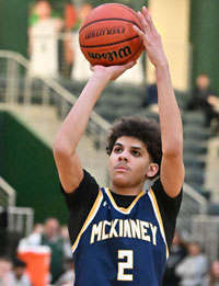 McKinney Lion Braden Givens tied the game with a free throw to make the score 50-50 in regular play. The Prosper Eagles won in overtime 57-54. (photo by Lockard Koval/BuzzPhotos.com)