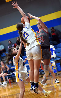 Sam Rayburn's Dixie Chaffin puts up a shot as Dodd City's Addison Weeks goes for the block.