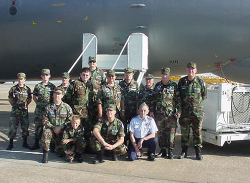 Fourteen members pose at the entrance door to the IL-78 tanker.