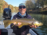Lynn Hackfield of Matagorda, Texas, was a happy angler after landing this pretty Little Red River brown trout recently while fishing with guide Mike Winkler.