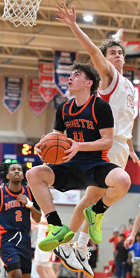 McKinney North sophomore Aiden Spurrier works to get a shot off under the basket. (photo by Lockard Koval/BuzzPhotos.com)
