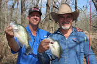 (L-R) Guide Chris Webb and Kenneth Shepherd show off some nice crappie landed from a backwoods creek last week. Spawning crappie have moved into the creeks above reservoirs and catching should remain good a few more weeks. (photo by Luke Clayton)