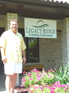 Director of Sales Jim Simpson.“The word is out,” Director of Sales Jim Simpson says as he looks out his office window at the designated lot sites that are now on the market. “Initially we advertised locally because we wanted them to have the first opportunity, and I am pleased with the response we have had so far. I appreciate the level of interest Legacy Ridge is creating in this area and as we approach our fall opening the support is building almost daily. Lot sizes vary from 15,000 square feet to 35,000 square feet and we have three separate zonings. Our first phase will include 52 home sites; S-1 lots will be a minimum of 1900 square feet of living space and feature an exterior of at least 75% brick. The S-2 lots will be a minimum of 2500 square feet living space with a 90% brick exterior. Legacy Ridge’s S-3 zone will be comprised of homes with a minimum of 3000 square feet of living space. The S-3 homes will also have a 90% brick exterior. To protect the integrity of our lot-owner’s investment, an Architectural Control Committee will ensure compliance. Utilities are going in now and I expect the streets to be in by late September. Nine holes are well on their way to being the unique and challenging golf experience that the developer, Dan Glaser, and our talented architect, Bill Johnston, envisioned and they should open in November. The other nine holes are sprigged and we have them scheduled to open in the summer of 2003.”