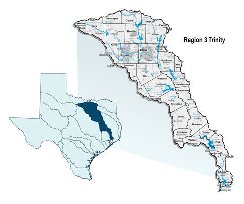 The Trinity RFPG’s planning region (Trinity River Basin or Region 3) has an estimated population of approximately 8 million and spans nearly 18,000 square miles across 38 counties from Cooke County in the north to Chambers County on the Gulf Coast.