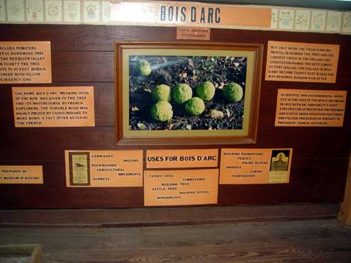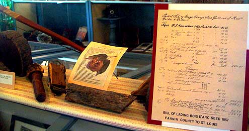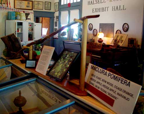 Tom Scott, the director at the Fannin County Museum of History, has a much cuter story about plant “A” winking at plant “B” and the impending cross-pollination somehow gave the world a fruit that only a squirrel can enjoy. Or maybe that was just my version of Mr. Scott’s story, but the museum has a very informative bois d’ arc display, including an actual bow made of the legendary wood. Obviously, the true “fruit” of this species is the wood that was once considered the most elastic wood in the world and the “fruit” was also the yellow paper-like lining of the roots and inner bark that produced a treasured dye. Modern day North Texans mostly consider bois d’ arc a fencerow nuisance, but in it’s day this tree grew roots into Europe. In a small way it still does. Woodworkers the world over have heard of the qualities of this yellow wood and there is still some trade, mostly over the internet these days, of straight “blanks” so a traditional bow can be fashioned from the favorite wood of Native Americans.