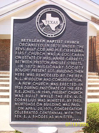 An excellent example in Bonham is the Bethlehem Baptist Church. According to church records, the original building, constructed in 1871, was a log structure located between Preston and Lee streets. As the congregation grew, church members decided to buy the lot on Franklin Street that is the site of the present church building, built in 1924.