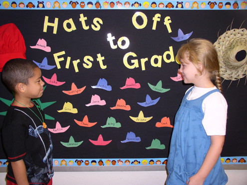 Shown here is Kathryn Coyle and Kee’andre Rogers standing tall by this bulletin board which greets the first graders as they enter their classrooms.
