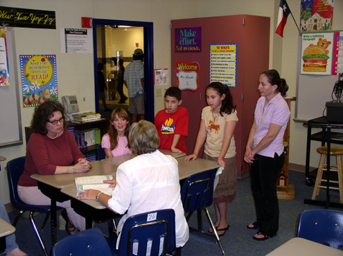 Shown here are parents, Alba Muniz and children Katherine and Eric, and Rae Burks and children Anastasia and Gabrielle as they visit with homeroom teacher, Mrs. Winnett.