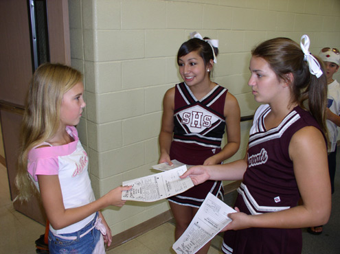 Sherman High School cheerleaders, Jordyn Herd and Roxy Marroquin hand out flyers advertising the cheer clinic which was held Saturday, August 25 for girls, ages 4-12.