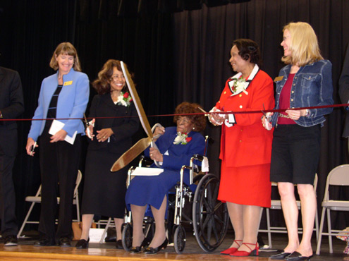 Shown here are Sue Frazier, Charlotte Neblett Douglass, Ruby Jo Williams and Kate Whitfield looking on as Pauline Neblett "cuts" the ribbon at the dedication ceremony of Neblett Elementary.