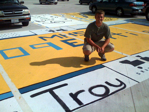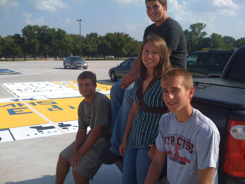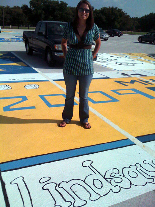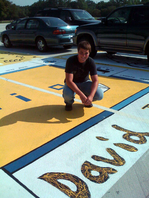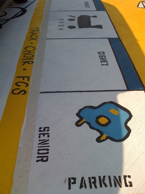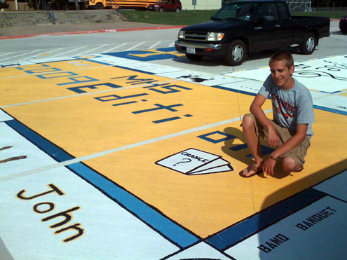To achieve their design dream based on a band mate’s suggestion, Troy Maikowski awoke at the crack of dawn to be the first in line to reserve four adjoining parking spots. Lindsay Schermer, John Wilson and David Cullinan soon joined him and over a weekend, under the blazing Texas sun, the four designed, measured, taped, and hand-painted their version of McKinney High School Senior Monopoly on their four parking spots.