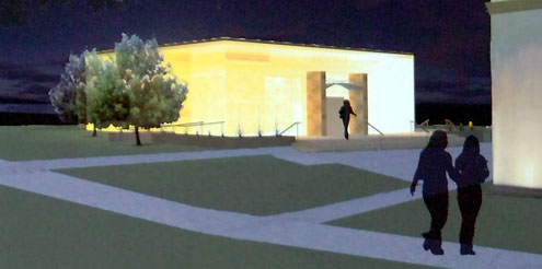 The new annex will be a 6,000 square foot contemporary glass structure that will illuminate a redesigned courtyard behind the library during nighttime events. The two structures would seem to compliment each other in style and function. The annex will feature a 100-seat auditorium specifically designed for intimate lectures, the viewing of documentary films and historical presentations.