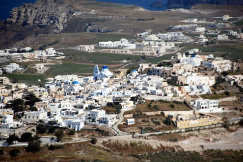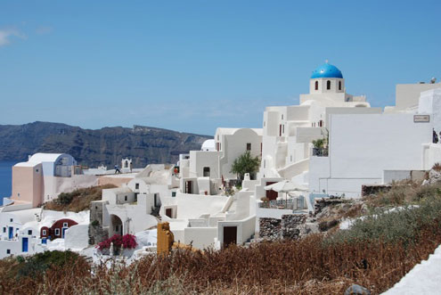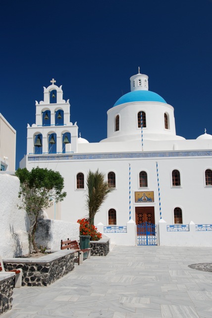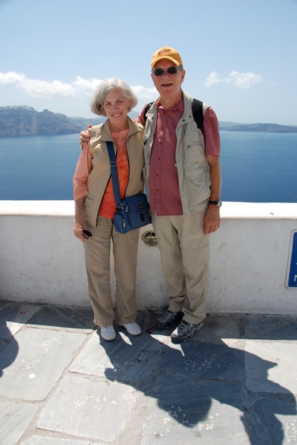 Day three of the cruise found us off the coast of Santorini, the epitome of a Greek island, all white buildings and blue-bluer-bluest rooftops. Formed by a volcanic eruption around 1500 BC, the island’s resulting soil of ash and pumice is the basis of their wine industry. The towns cling to the side of the cliffs which surround the caldera where the ships anchor. There were five cruise ships in port the same day we were; no wonder Santorini’s main industry is tourism. No wonder it took so long to get down from the heights to the dock via cable car. Braver souls took the 589 steps of the donkey stairs. Think the Grand Canyon’s Bright Angel Trail but made of concrete. But first, we visited a winery with spectacular views, then the town of Oia. (ee-ah) When I had my digital photos printed, the clerk asked where we’d been. It wasn’t the photography which had her in awe; it was the scenery itself.