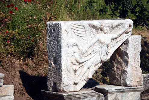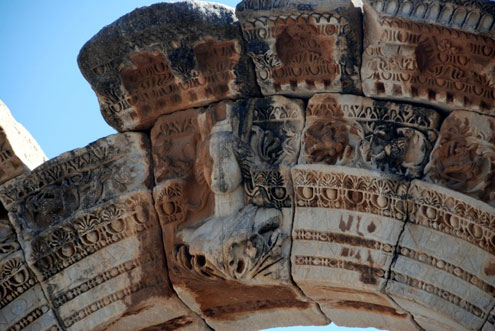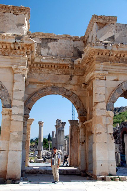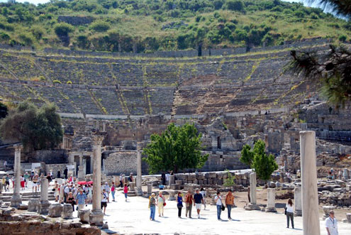 Originally Greek, originally a port, Ephesus became the second largest city in the Roman Empire in the 1st century BC. War, earthquakes, and time all took their toll. A river silted in and the port was gone. What is left has been cyclically restored and destroyed through the centuries and it took us two hours to walk… and walk and walk… from entrance to exit. It’s hard to say what was the most impressive: the Library of Celsus, the Greek statuary, the men’s public facilities. (One can only hope that, as there weren’t any women’s public facilities, the men had to pay a euro equivalent to get in.) Or, perhaps the amphitheatre. Built to hold 25,000, or 10% of the population, it stretches up and up in a semi-circle about a stage. We sat and watched as groups and individuals cavorted on it, mugging for the camera one member of the party was aiming. And then, we were witness to a goose-bump moment.