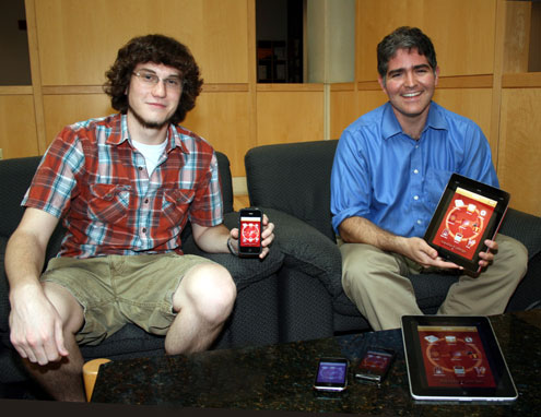 Senior Ryan Gant (left) and assistant professor of computer science Aaron Block (right) show The Austin College App on iPhones and an iPad. Austin College is among only a few colleges that allow students to create an iPhone application in a course.