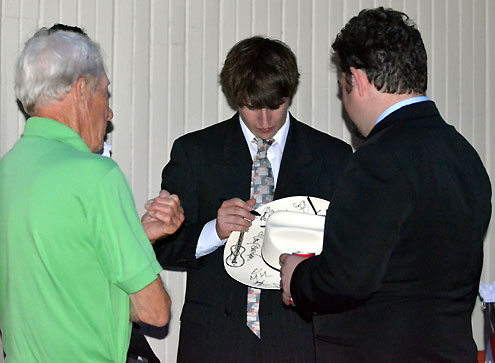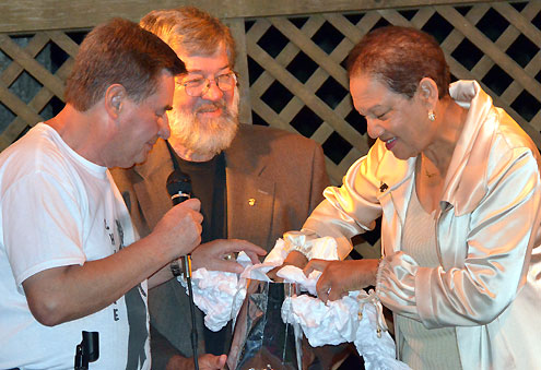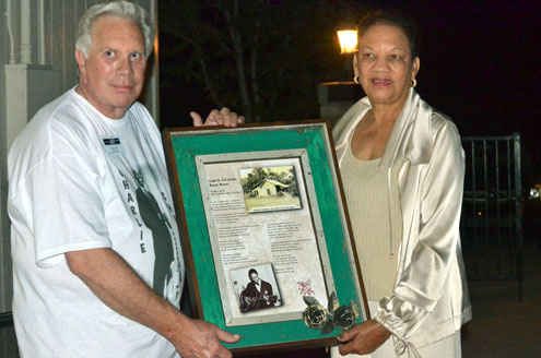 A good-natured bidding war pushed the price of a commemorative picture frame fashioned from wood taken from Christian's home as it was being razed to $1,000. Terry Blose built the frame and Fannin Community Foundation Executive Director Bob Self had the winning bid of $1,000. In a magnanimous gesture, Mr. Self presented the one-of-a-kind picture frame to Arnold, who will take it back to a museum in Oklahoma City.