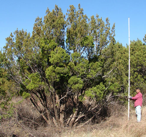 Dr. Mustafa Mirik, Texas AgriLife Research associate scientist at Vernon, takes a measurement of a redberry juniper tree before it is harvested for the study. (Texas AgriLife Research photo by Dr. Jim Ansley)