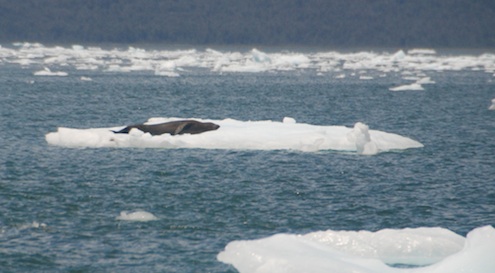 Only one excursion was available in this middle of nowhere, and we were fortunate enough to be assigned to the afternoon catamaran tour to the Laguna San Rafael, a north-south fjord. The sky was clear, the weather warmer than the morning, and the seas less upset. We cruised through an inlet and started seeing ice floes of various incredible shades of blue. And one had a passenger.