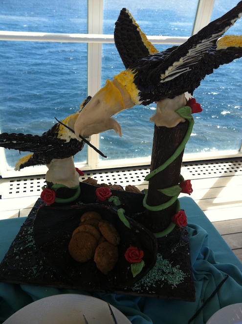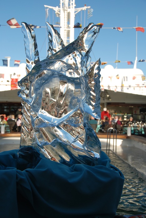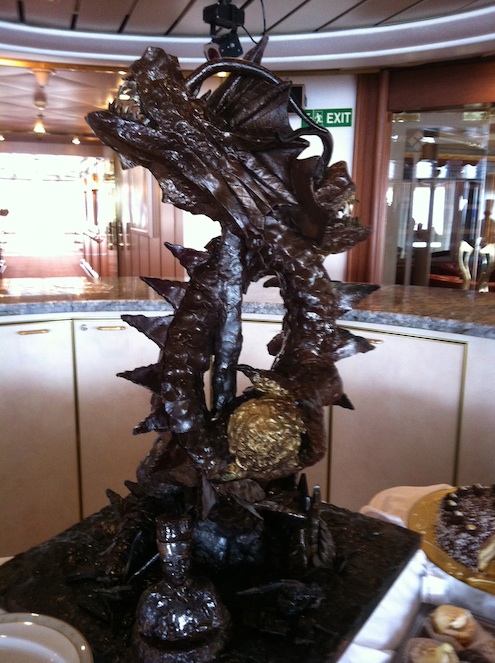 But this night was the big party up on the pool deck with food stations and ice sculptures and a “British Invasion” revue put on by our very energetic and young entertainment staff of singers and dancers. Loads of fun and a terrific sunset.