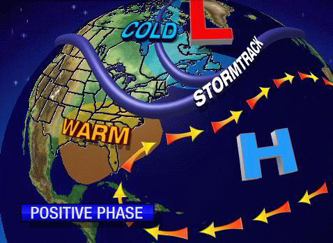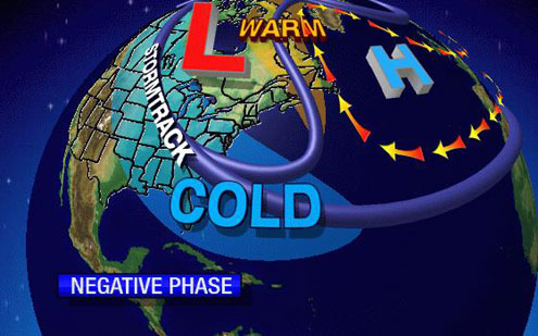 A negative NAO generally signals a greater penetration of cold air southward east of the Rockies, while a positive NAO tends to favor mild and dry winter weather through most of the nation.