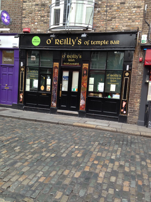 O’Reilly’s of Temple Bar -- Temple Bar is an area on the south bank of the River Liffey in central Dublin. Unlike the areas surrounding it, Temple Bar has preserved its medieval street pattern, with many narrow cobbled streets. It is promoted as "Dublin's cultural quarter" and has a lively nightlife that is popular with tourists.