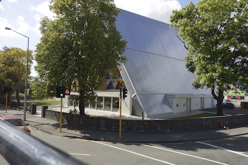 While the Cathedral had been damaged in previous earthquakes, the February 2011 quake destroyed the spire and severely damaged the rest of the building. The Diocese wished to destroy it and demolition began. It was halted by the High Court of New Zealand when heritage groups from around the world protested any further demolition. So it stands now surrounded by fencing, an open wound. A Transitional Cardboard Cathedral is located just minutes from the damaged one. Designed by Shigeru Ban, a Japanese architect, it is predominately made from cardboard tubes.
