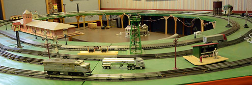 One of the rather unique features of this display is that it will accommodate three sizes of trains: Standard gauge (primarily made by Lionel, Ives, American Flyer, and MTH), with a scale of 1:25; “O” gauge (made by Lionel, Atlas, and Weaver, 1:48; and “O-27” (made by K-Line, Lionel, and Marx), with a scale of about 1:52. The innermost loop of track has five rails and will permit simultaneous operation of a Standard gauge train and an “O” gauge train. The two outside loops will accept “O” gauge or “O-27.”
