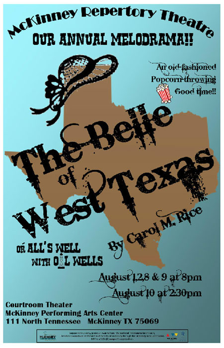 McKinney, Texas -- The villain is back and boy howdy there’s trouble! He is trying once again to swindle people out of their much needed and hard-earned money. McKinney Repertory Theatre (MRT) presents their annual melodrama, this year it’s The Belle of West Texas, August 1 – 2 and August 8 - 9 in the Courtroom Theatre at the McKinney Performing Arts Center (MPAC) at 8 p.m. and a matinee at 2:30 p.m. August 10. Tickets are $17 – Adults, $14 – Students/Seniors and $12 – Children.