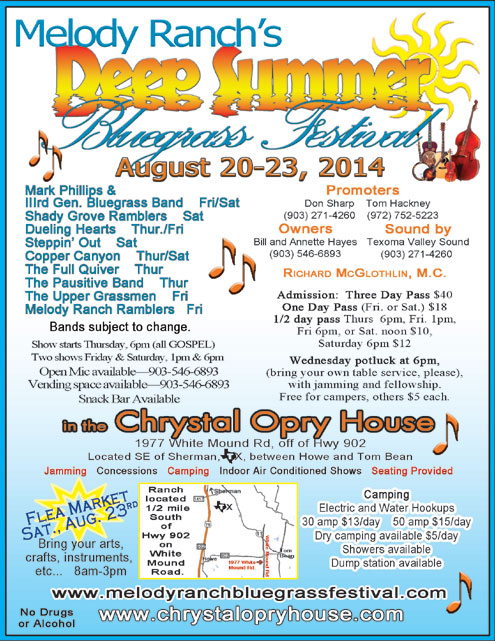 Make plans now to attend our Deep Summer Bluegrass Festival August 20-23. We have a kick-off potluck supper on August 20. at 6:00 p.m. which is free for campers. Non campers who wish to participate please call 903-546-6893 for details. There will be fellowship and jamming afterwards.