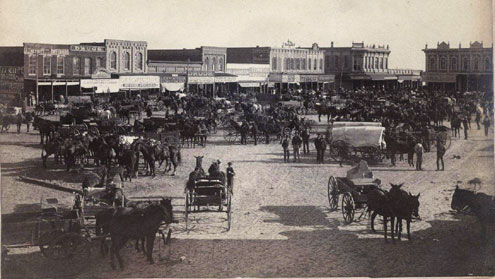 The photograph of the Honey Grove Square shows the east side of the square on a market day, with the square full of wagons pulled by horses and mules.