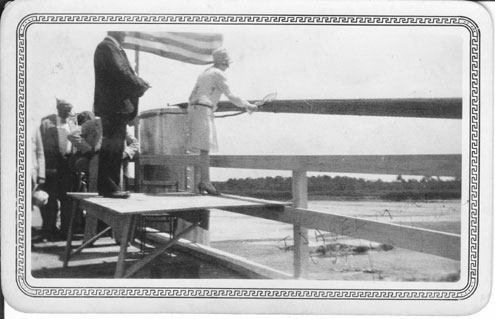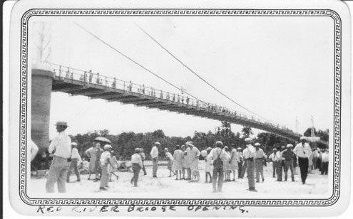 A formal opening of the Telephone Suspension Bridge was held roughly one month later on August 11th. Again there was a christening with a bottle of Red River water, broken this time by a Bryan County lady named Anna Jo Lee, a picnic, and music provided by the municipal bands of Bonham and Honey Grove.
